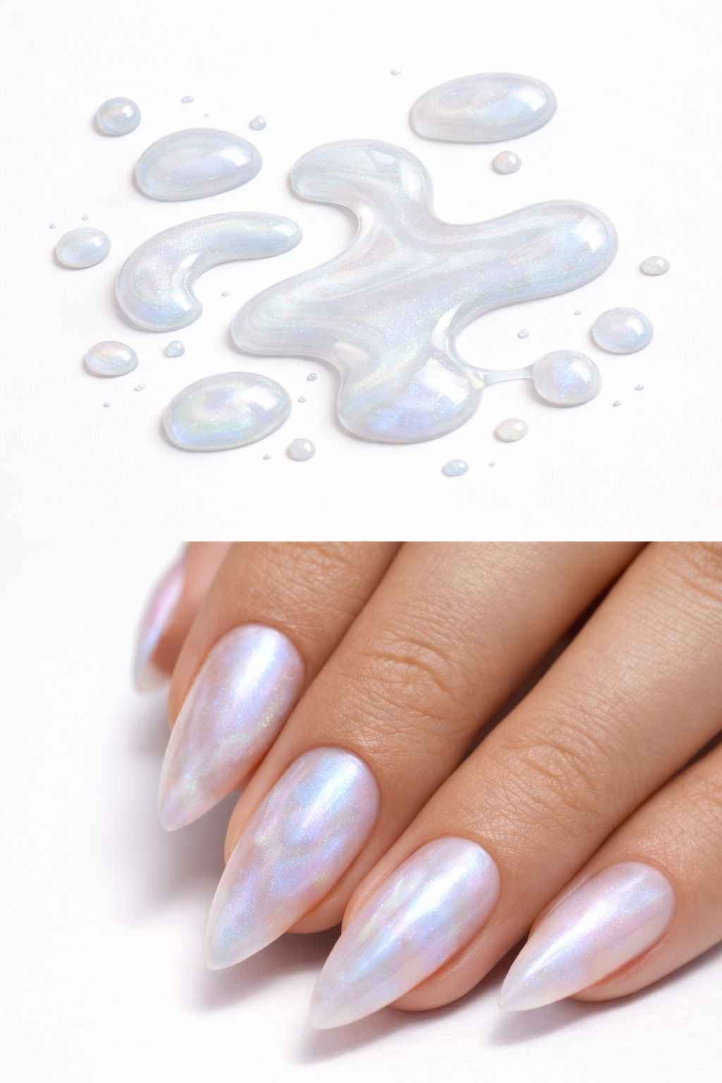 Pearl Glow is a sheer, luminous pearl with a cool, ethereal blue glow that catches the light like moonlit glass. Clean, airy, and endlessly versatile, this shade enhances rather than overwhelms.