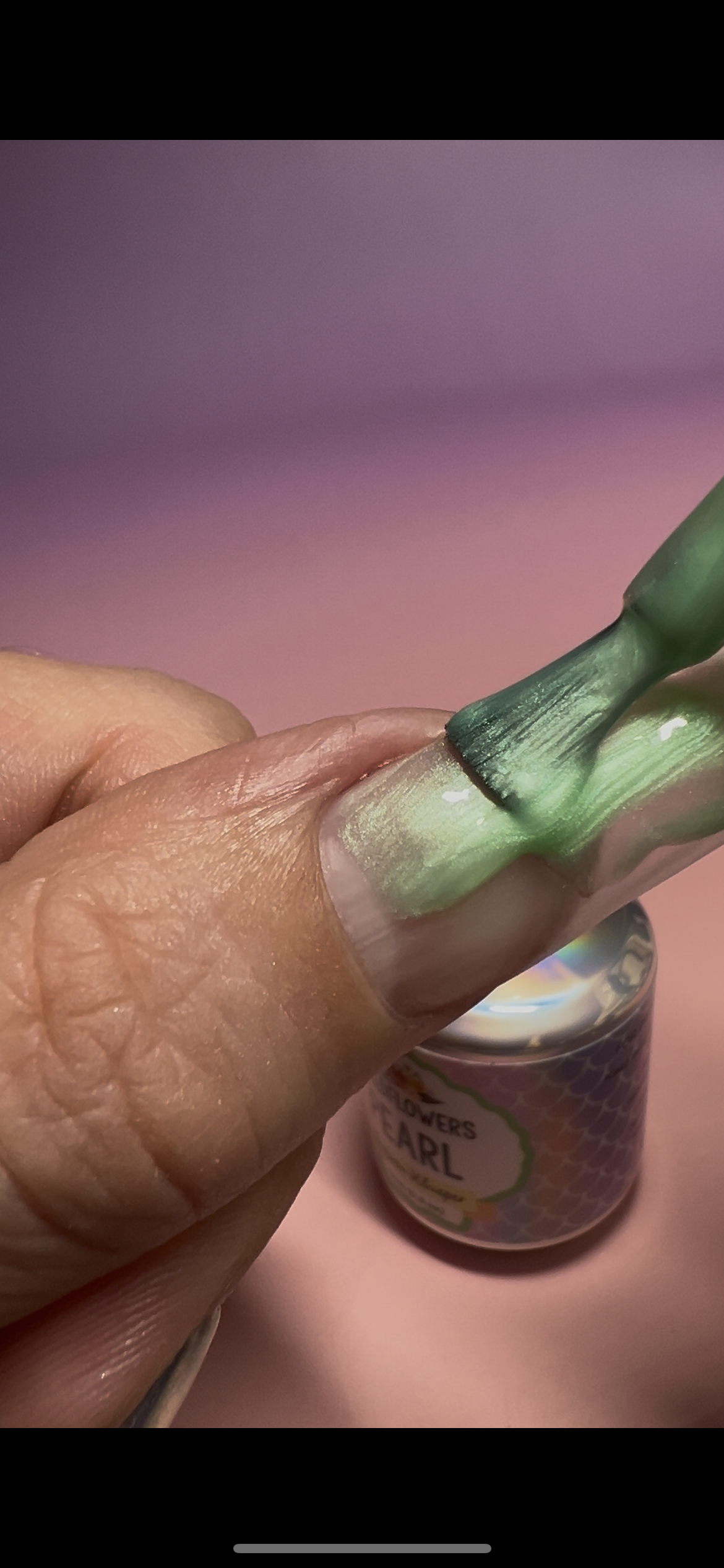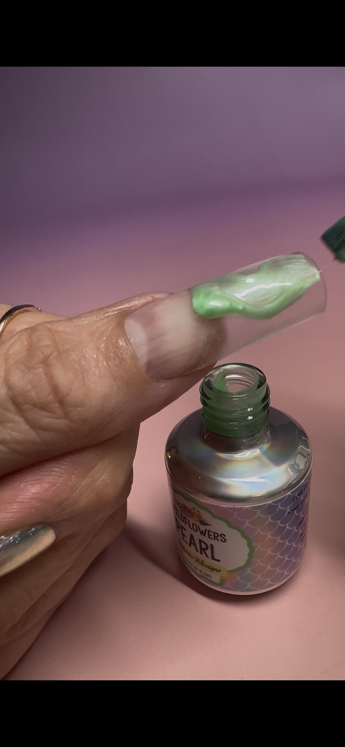Seafoam green base with a soft silver pearl glow