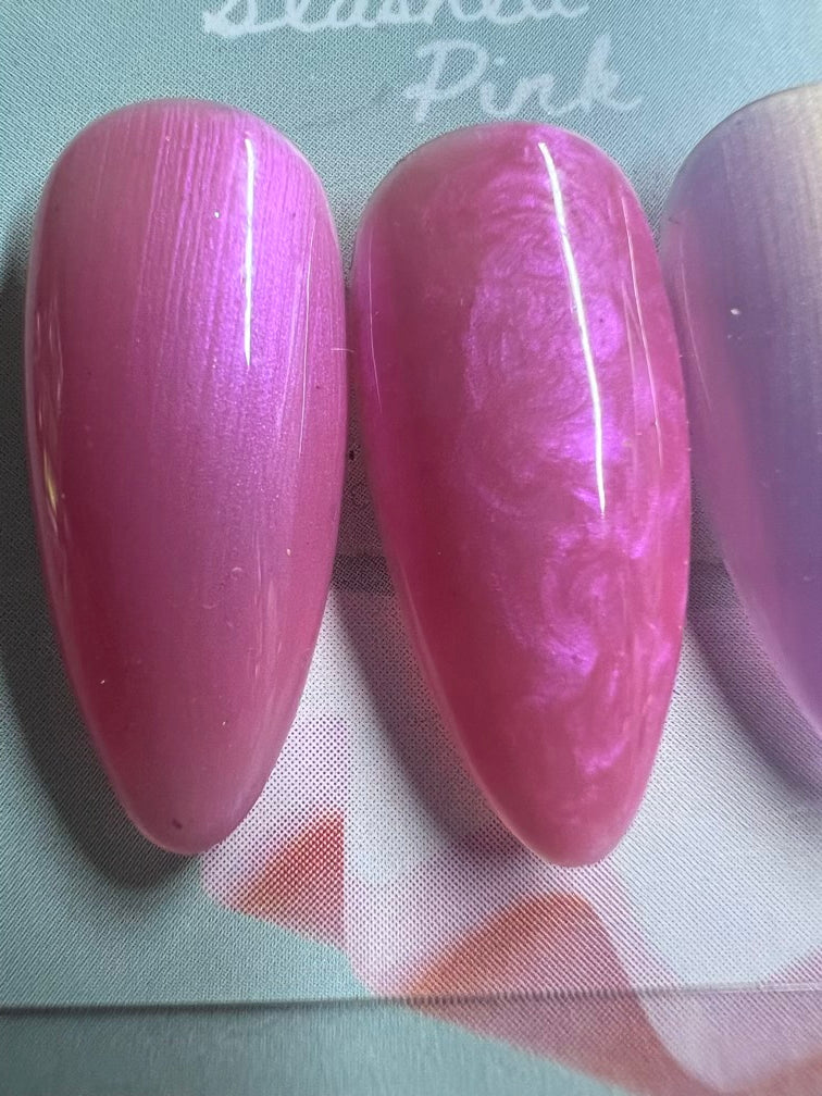 Seashell Pink is a soft candy-pink pearl with a delicate purple glow that blooms as it catches the light. Feminine, luminous, and quietly magical, this shade feels like polished seashells warmed by the sun.