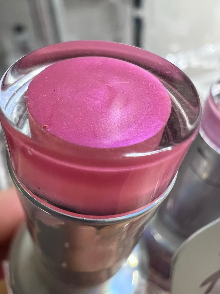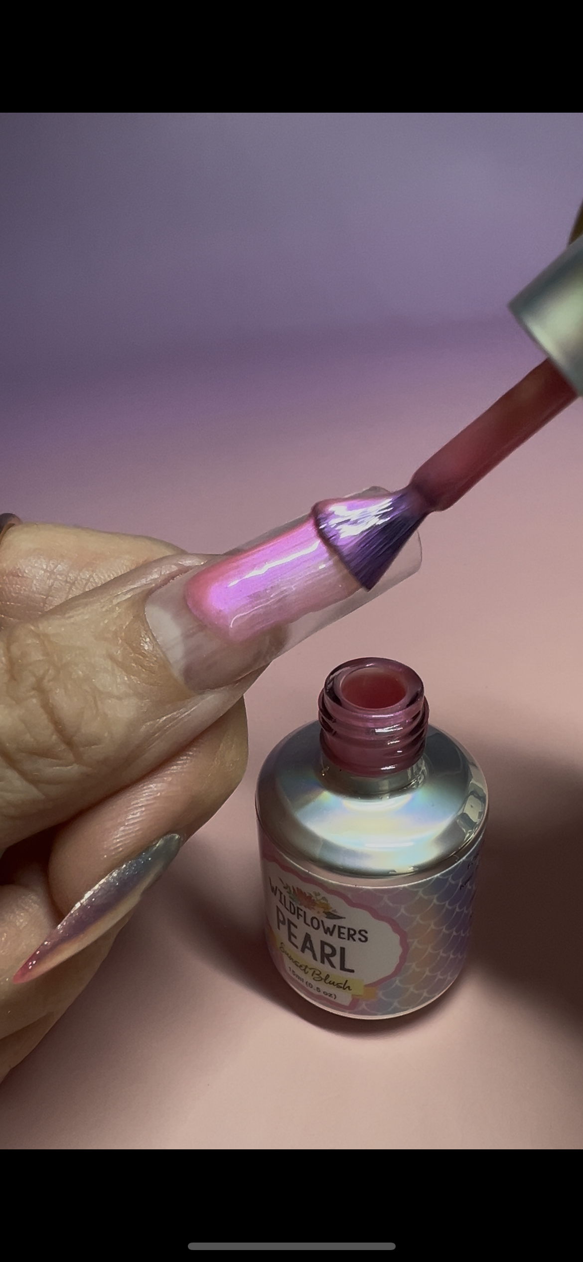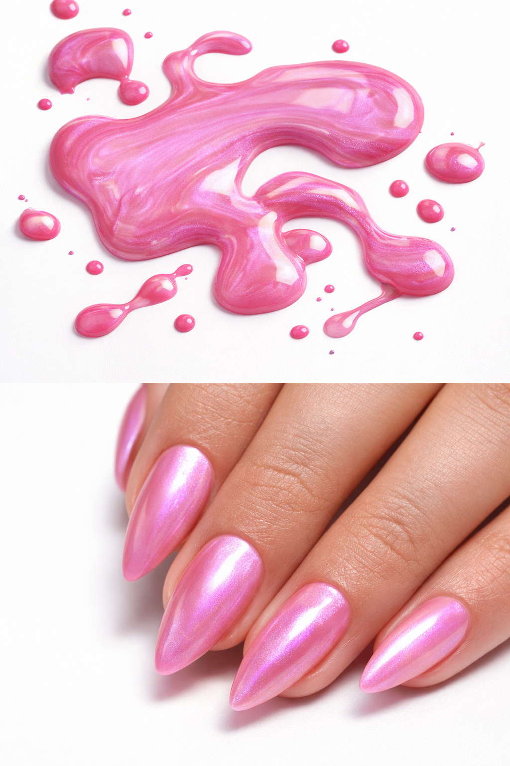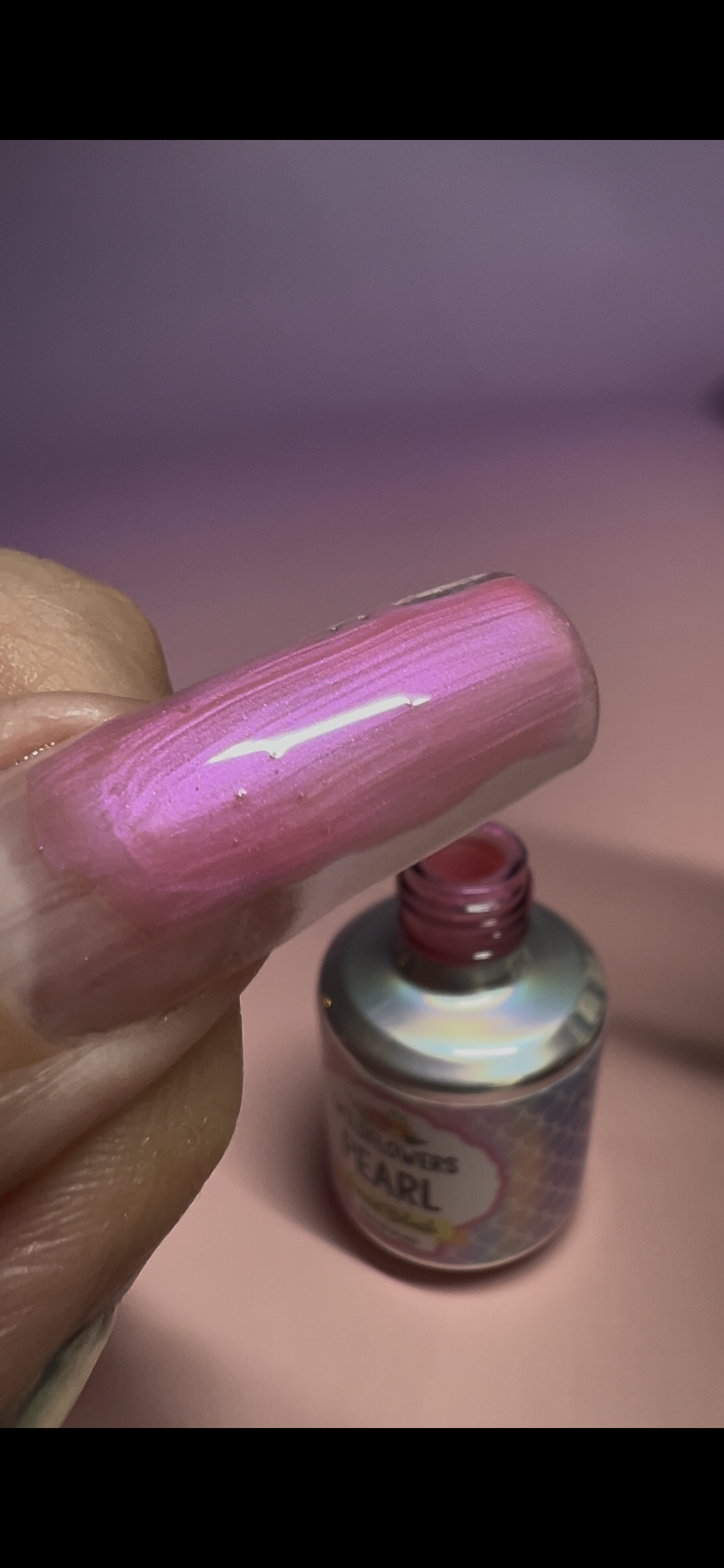 Candy-pink base with a soft violet pearl glow