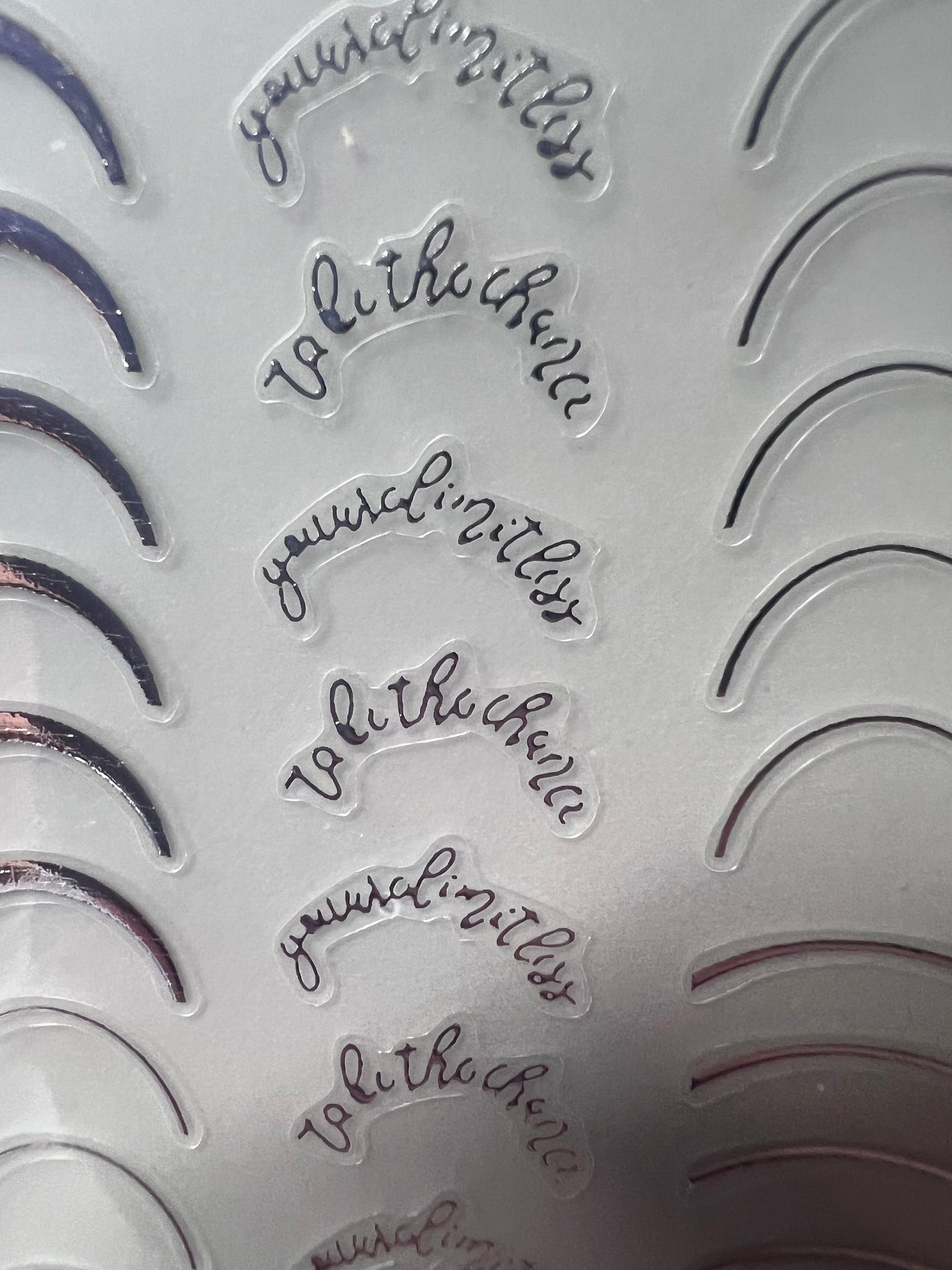 20 HIGH QUALITY decals - these are NOT water decals, they're vinyl stickers. You remove them carefully with tweezers, and they even have a bit of stretch and bend which makes them PERFECT for the surface of nails. MY THUMB is a size 2 with a 50% C-Curve... I left it in the picture for size reference.